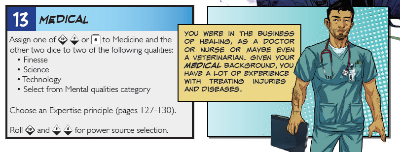 It offers another cool way to think about character creation. It also makes me wonder how well one could design a lifepath system for Sentinel Comics. I will think about this when designing for other games, and I would love to tinker with character creation; at least, to make it so the Medical background is not automatically better and more interesting than any other option.
