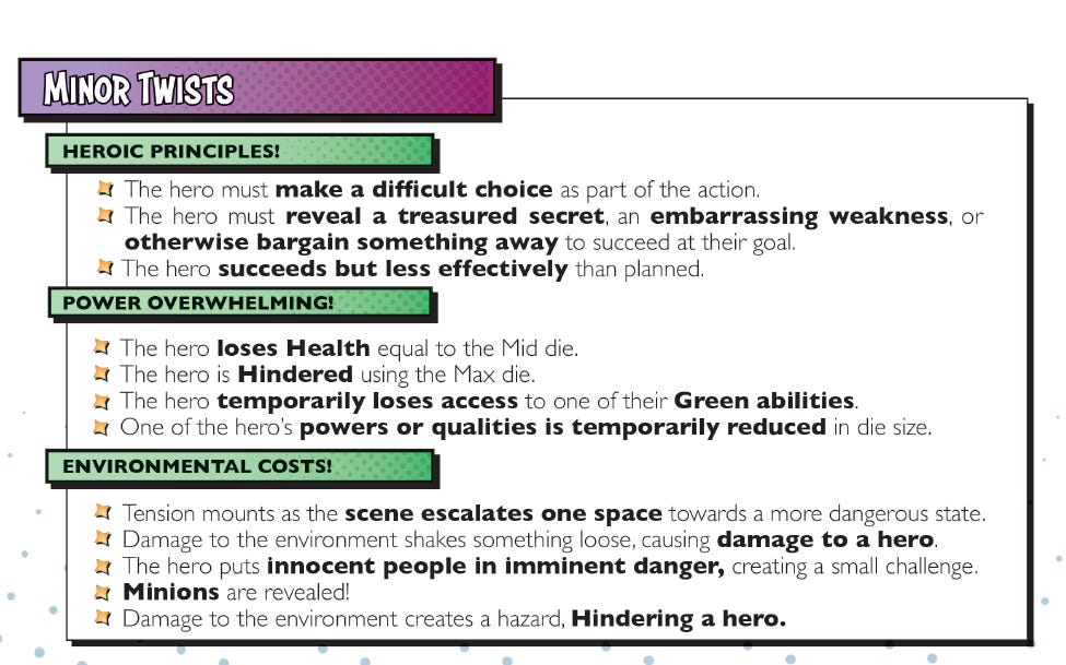 So, a Challenge is anything that you can’t Attack or Defend. Things you solve by saving a bystander, holding a collapsing building, stopping a train with your spider glutes, hacking the world, etc. are covered by Overcome. Now the thing is, Overcomes don’t have binary outcomes: you fail very rarely, while more often than not being able to succeed with a Minor or Major Twist.
